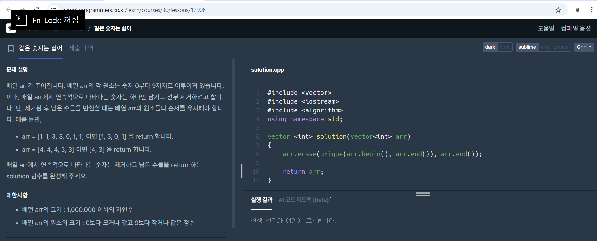 일일이 반복문으로 비교하면서 다른 배열에 넣어줘도 되겠지만 C++ STL에는 unique라는 함수가 있었다는 것을 기억해 냈기 때문에 쉽게 풀었던 것 같습니다.