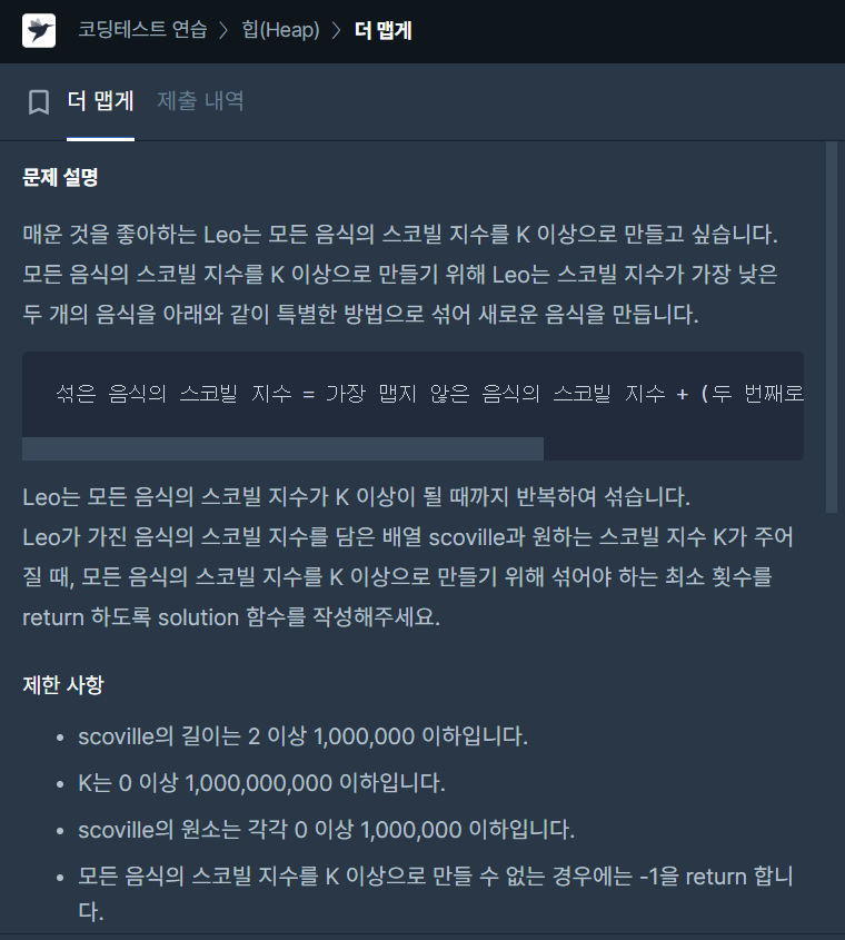 문제의 예외사항에서 모든 음식을 k이상으로 만들 수 없는 경우, 즉 pq의 top()이 k보다 작으며 size()가 1인 경우에는 -1이 return 되게 예외처리도 해주며 마무리하였습니다.