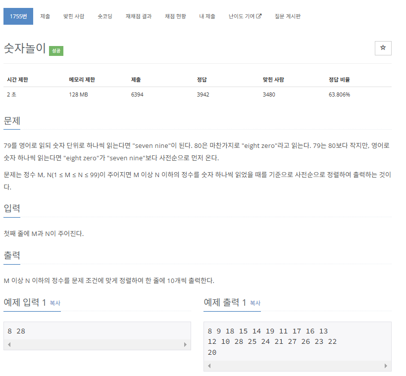우선 두 숫자를 줌으로써 범위가 주어집니다. 범위 사이에 있는 수를 문자로 표현하고, 사전순으로 배열하여 사전순대로 원래숫자 배열해 출력하라는 단순해 보이는 문제였습니다.