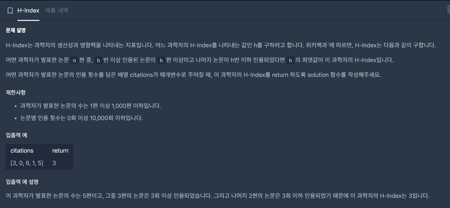 음 요약하자면,, HINDEX값을 구하는겁니다. 이게 무엇이냐면.. 논문 n편 중 h번 이상 인용된 논문이 h편 이상이고 나머지 논문이 h번 이하 인용되었다면 h의 최댓값을 hindex라고 하는데 이를 구하라는 문제입니다. 참 쉽죠?