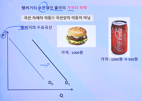 즉, 콜라 (보완재)의 가격이 떨어지자,